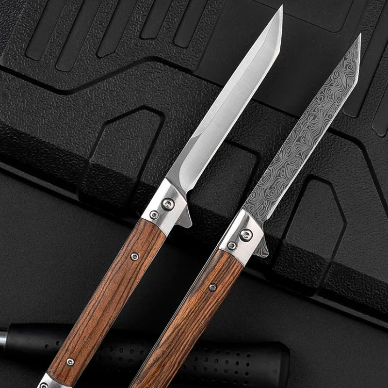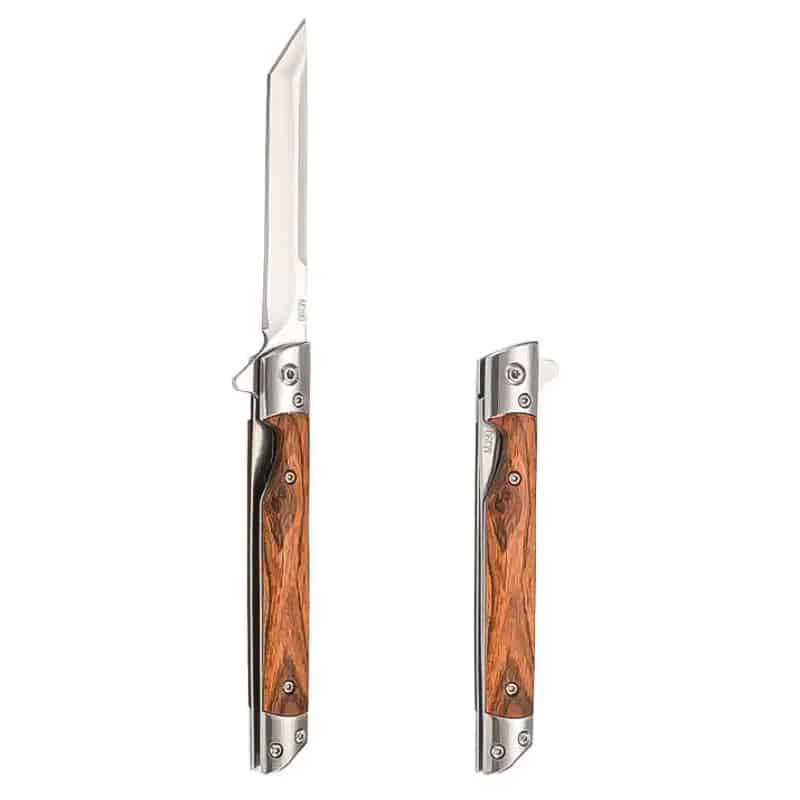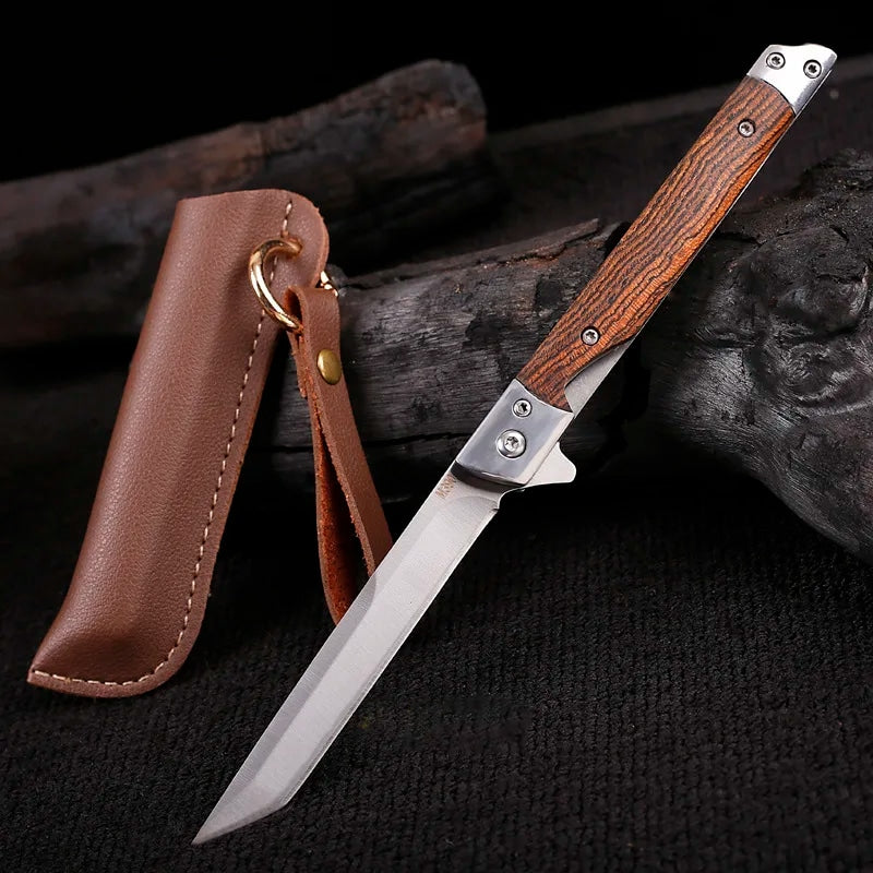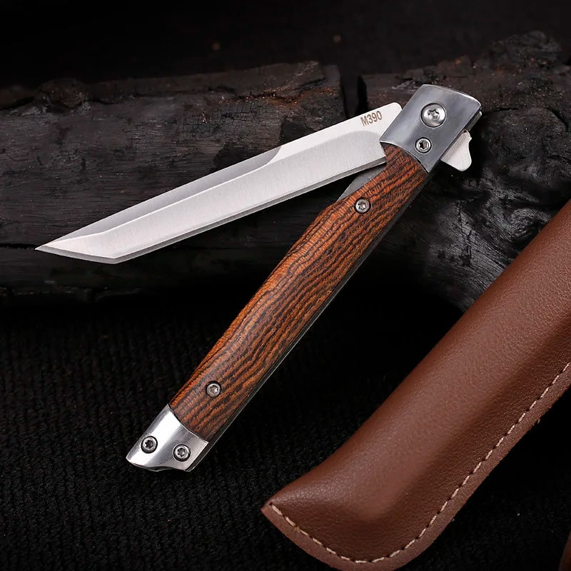 Briceag cu husa piele vegana - Cerb carpatin, varf tip japonez, lama pliabila, otel CM390, maner lemn santal
