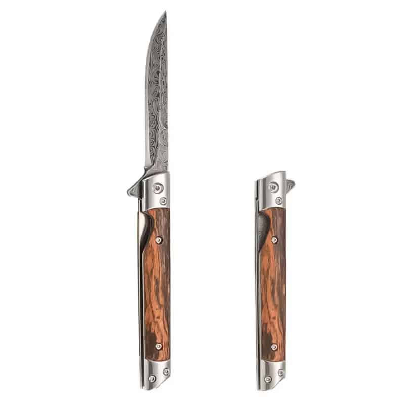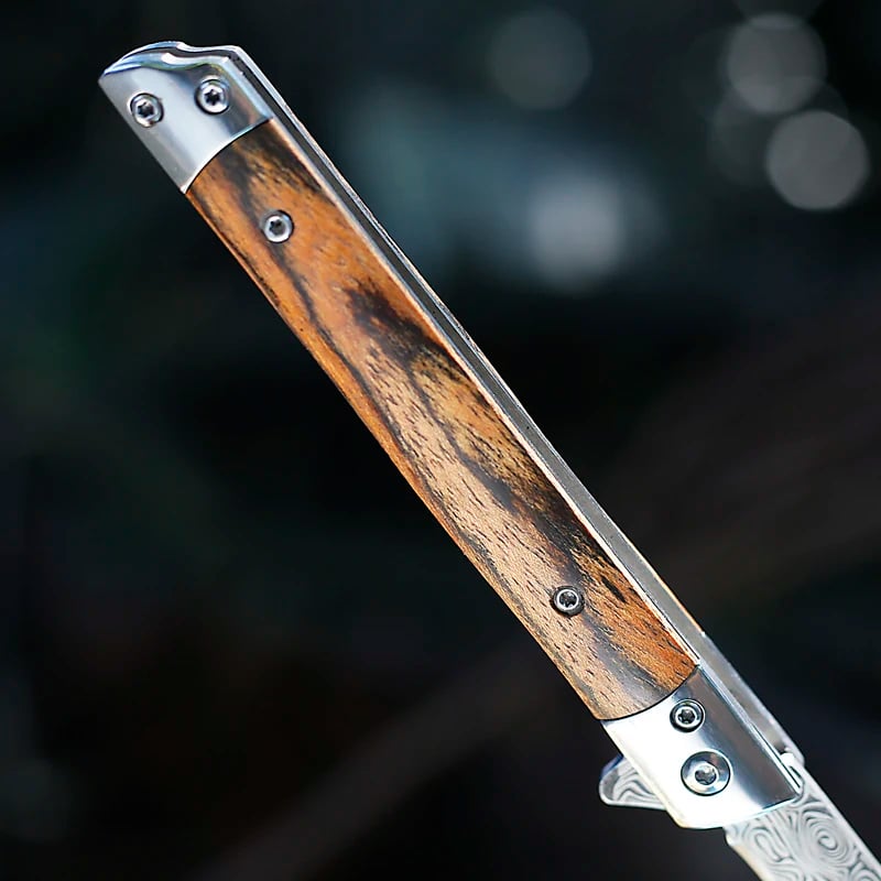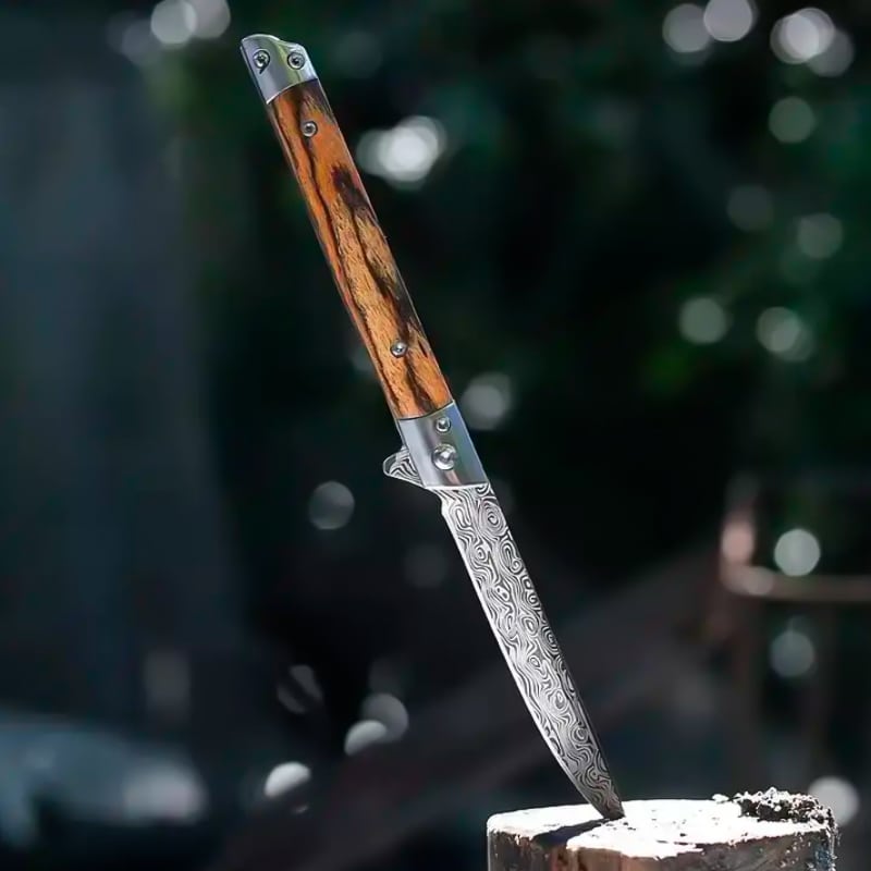 Briceag cu husa piele vegana - Cerb Carpatin, lama pliabila, otel japonez calire laser, maner lemn sandal