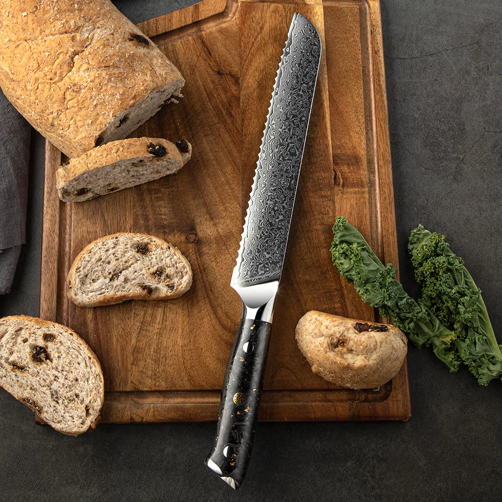 Cuțit de Pâine 20 cm – Lamă Damasc VG-10, Mâner din Rășină și Fibră de Carbon, Tăieri Precise fără Zdrobire