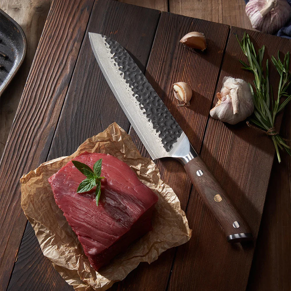 Combinând funcționalitatea cuțitului japonez Nakiri și versatilitatea modelului Gyuto, Santoku-ul Hikari devine rapid un instrument esențial în rutina ta culinară. Finisajul martelat (hammered) de tip Kurouchi previne lipirea alimentelor și reduce frecarea, pentru o eficiență maximă la fiecare tăiere.