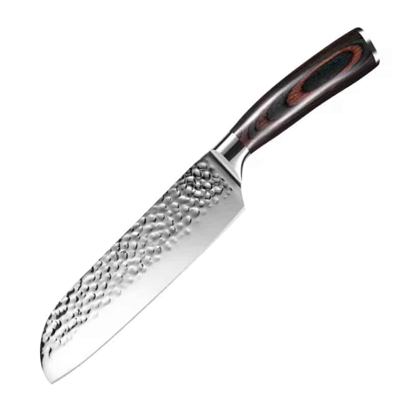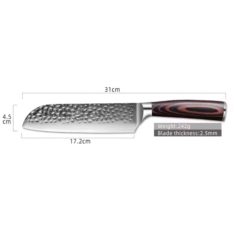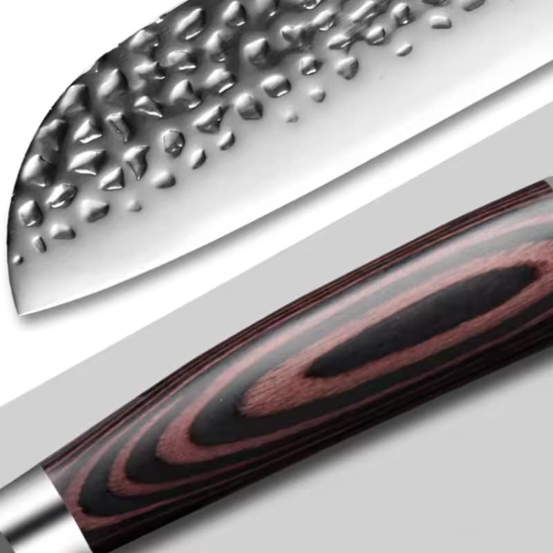 • Cuțitul Santoku: Inspirat din tradiția japoneză, cuțitul este ideal pentru trei funcții principale – tocare, feliere și mărunțire. Lama sa prevăzută cu alveole asigură o performanță optimă și un confort deosebit în utilizare.
