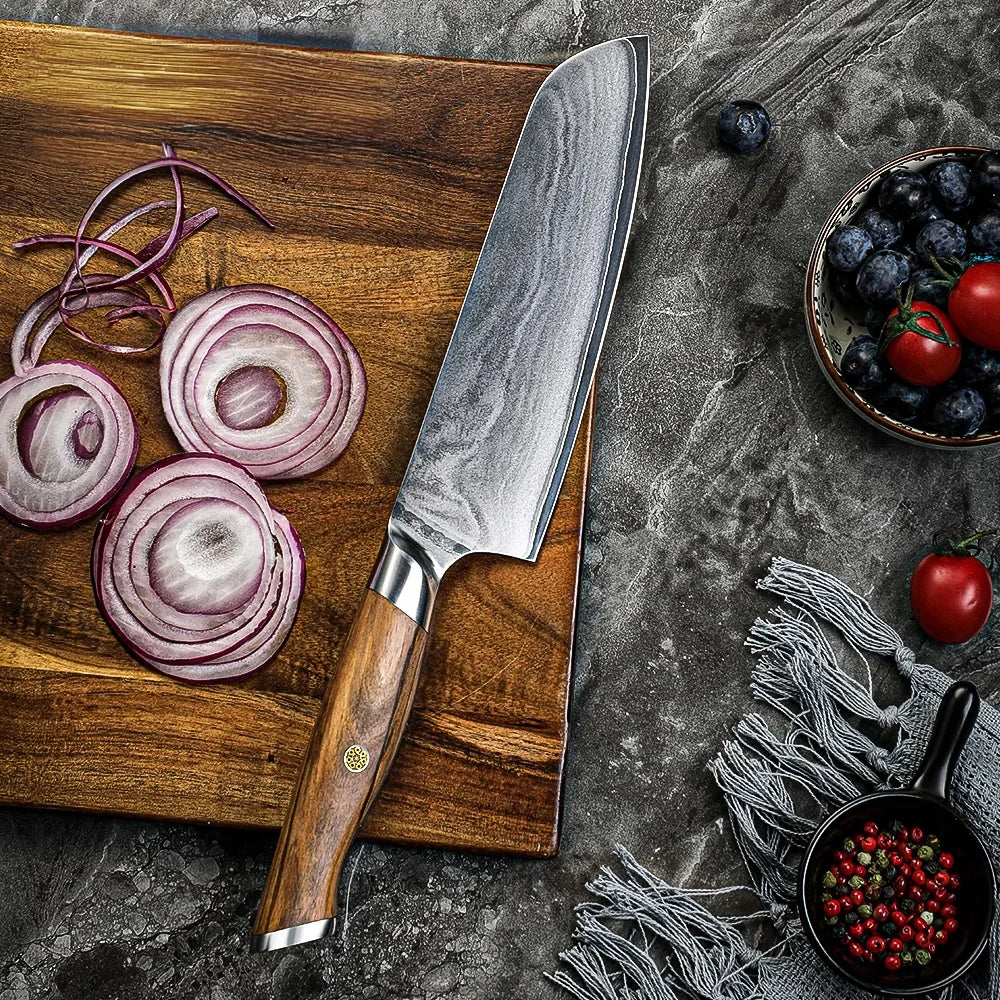 Cuțit Santoku – Lamă VG-10 de 18 cm, Mâner din Lemn de Măslin, Ideal pentru Feliere, Tăiere și Tocare Precisă