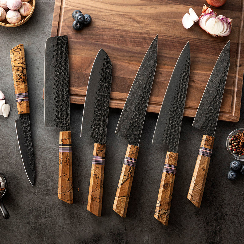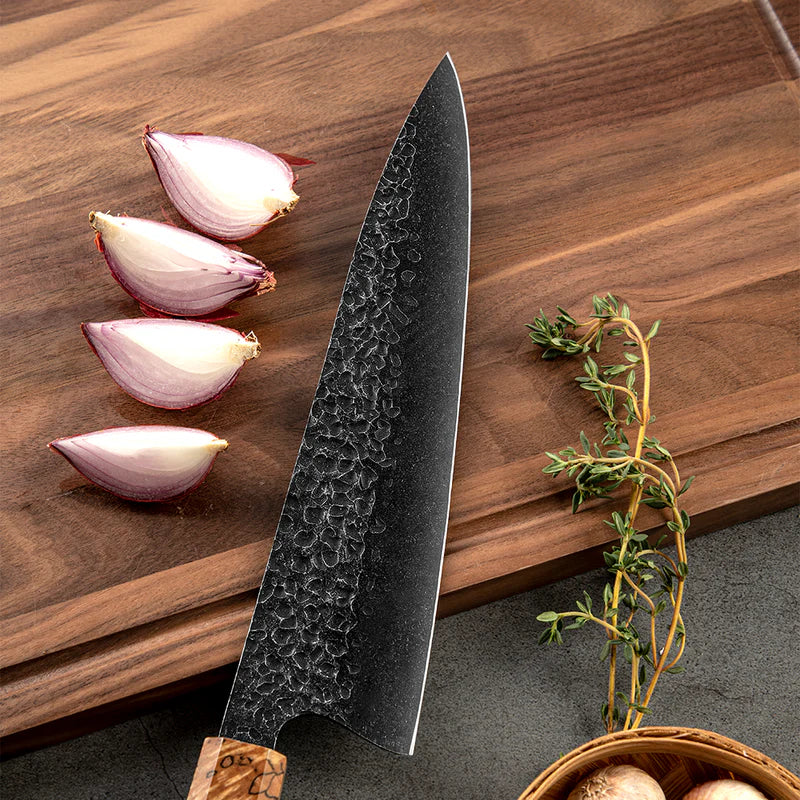 Cuțitul Bucătarului Profesional – Oțel Carbon cu Finisaj Hammered, Mâner din Arțar pentru Precizie și Eleganță
